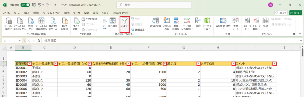 たとえば「イベント参加有無」「満足度」「費用感」などの各質問は、列項目としてそれぞれ独立し、1人分の回答が1行にまとめられている必要があります。このような縦横のルールを守ることで、フィルターやピボットテーブル、Power Queryなどの機能が正しく使えるようになります。
