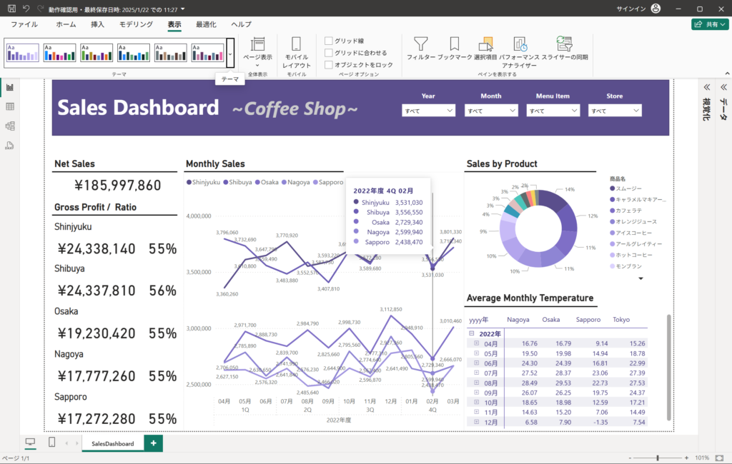 画面イメージは、「データ分析の第一歩」で作成したダッシュボードにテーマを適用した際のキャプチャです。